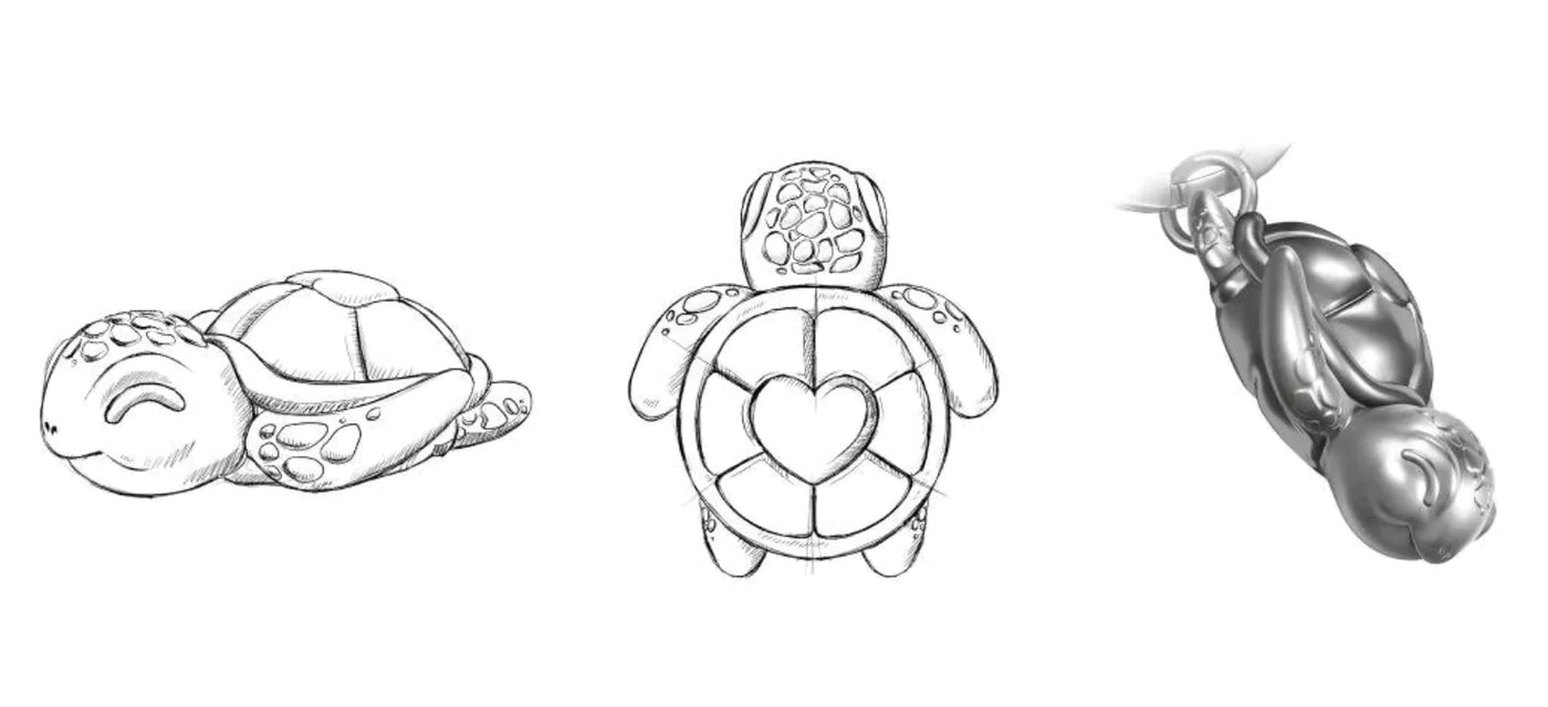 Becky zeichnet die ersten Entwürfe, wie hier mit unserem Schildkröten-Schlüsselanhänger "Snappy" dargestellt, ganz klassisch von Hand und erweckt sie als Design zum Leben. Aus virtuell wird greifbar: Per 3D-Drucker entstehen die ersten Prototypen.