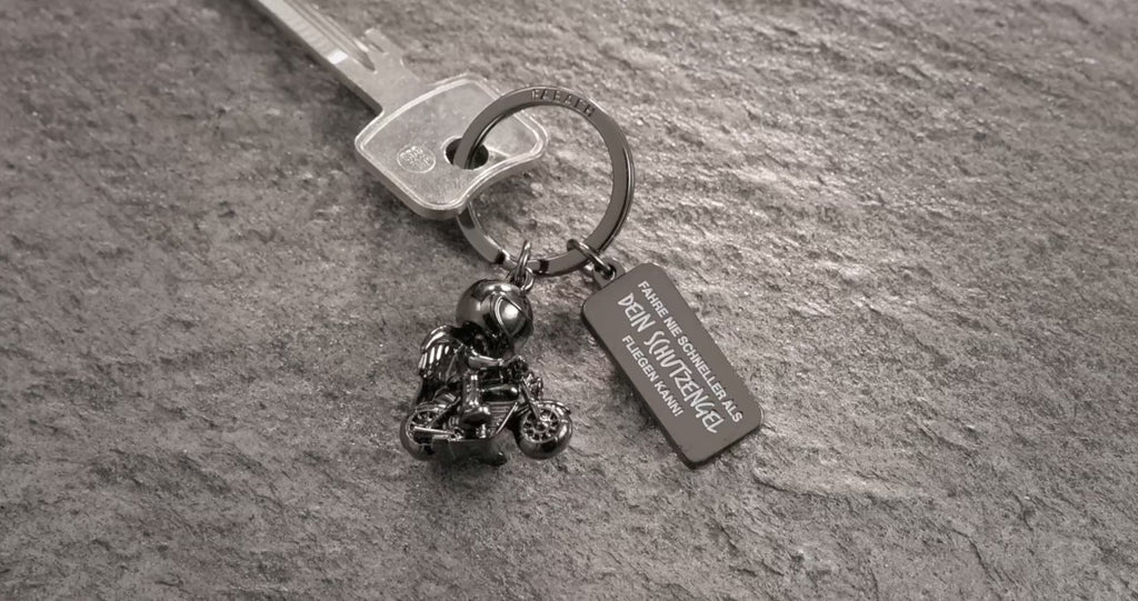 🏍️ Ein Schutzengel als Motorrad-Schlüsselanhänger: Ein Glücksbringer speziell für Motorradfahrer – mit einer liebevollen Ermahnung: Fahr vorsichtig. Der Schutzengel fährt auf seinem Miniatur-Chopper an der Seite deiner Liebsten und schenkt ein Gefühl von Sicherheit auf jeder Tour.